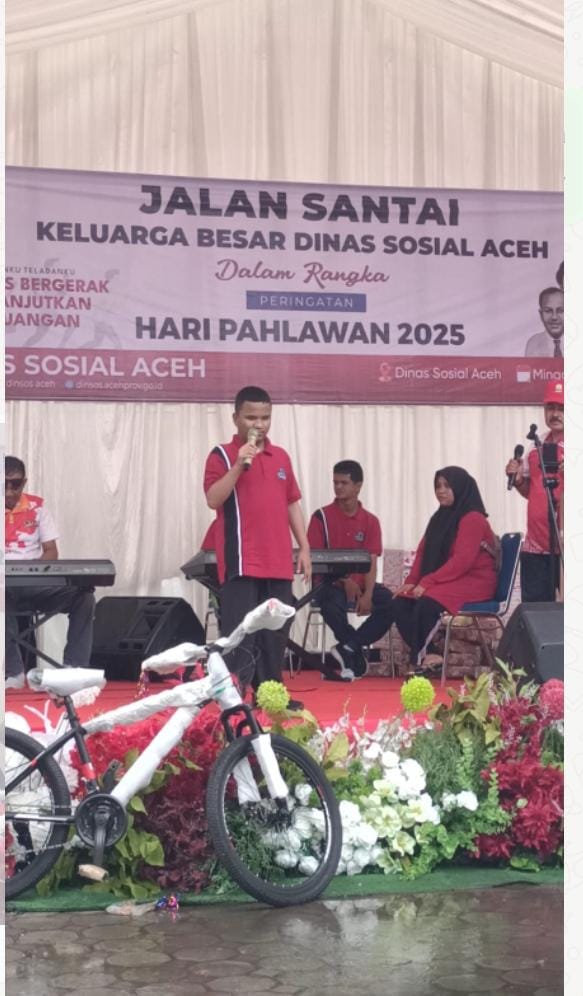 Banda Aceh |Bijeh.com— Kegiatan jalan santai yang digelar Dinas Sosial Aceh dalam rangka memperingati Hari Pahlawan 10 November berlangsung meriah dengan pembagian ratusan hadiah melalui sesi lucky draw. Hadiah utama seperti lemari es, sepeda, dan kipas angin menjadi pusat perhatian, disusul puluhan hadiah hiburan lainnya yang semakin menambah kemeriahan acara. Suasana makin hidup ketika peserta bersorak setiap kali nomor undian dibacakan, menjadikan sesi ini sebagai bagian paling ditunggu. Gelaran ini juga dimeriahkan oleh duo MC energik, Bang Prak dan Bang Iwan, yang berhasil menjaga ritme acara tetap hangat dan penuh tawa.