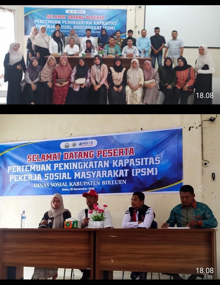 Bireuen, | Bijeh. com_ Plt. Kepala Dinas Sosial Aceh, Chaidir, S.E., M.M., mengajak seluruh Pekerja Sosial Masyarakat (PSM) di Kabupaten Bireuen untuk terus meningkatkan koordinasi dan memperkuat pelayanan sosial di tingkat gampong. Ajakan tersebut disampaikan saat menghadiri pertemuan Peningkatan Kapasitas PSM yang diselenggarakan oleh Dinas Sosial Kabupaten Bireuen.Rabu 19/11/2025