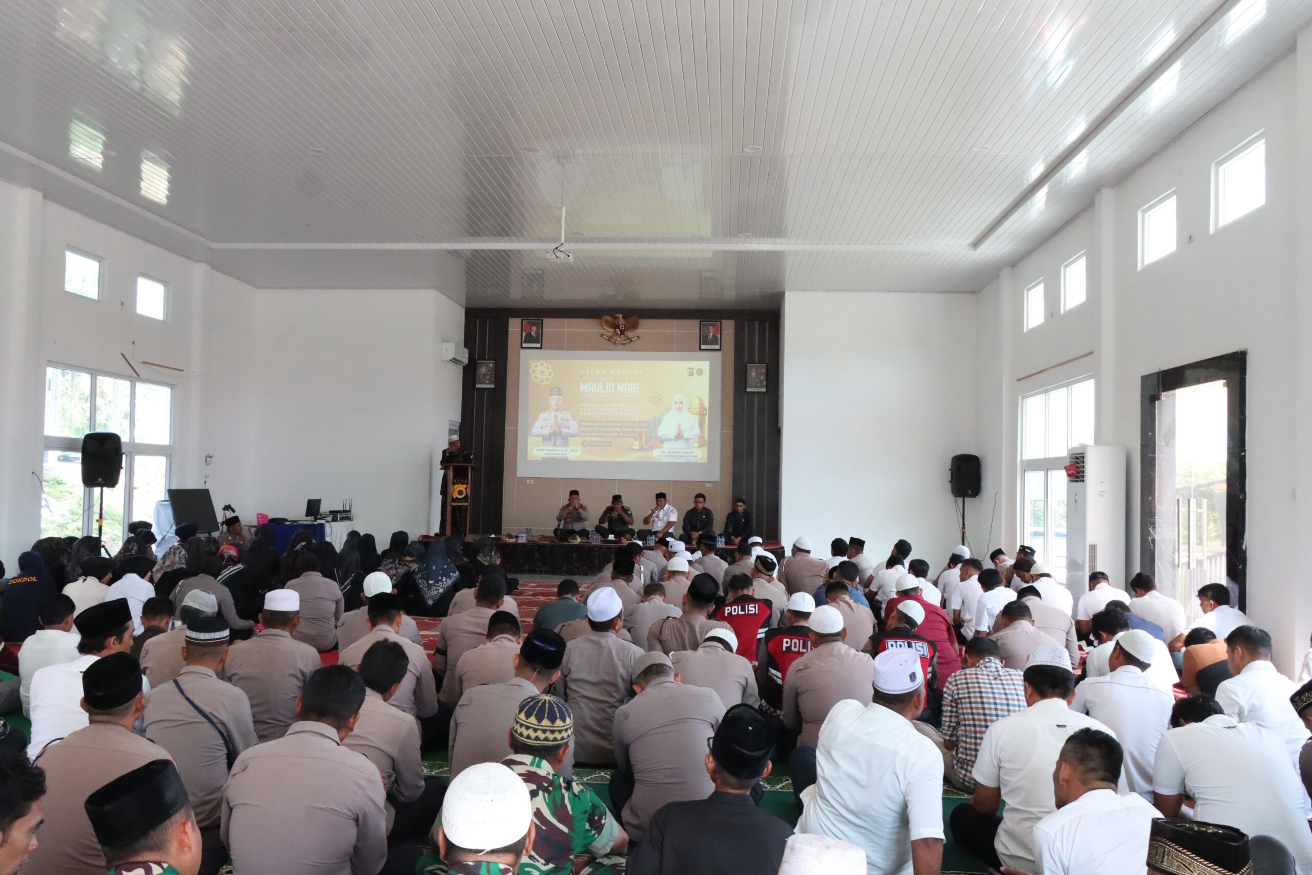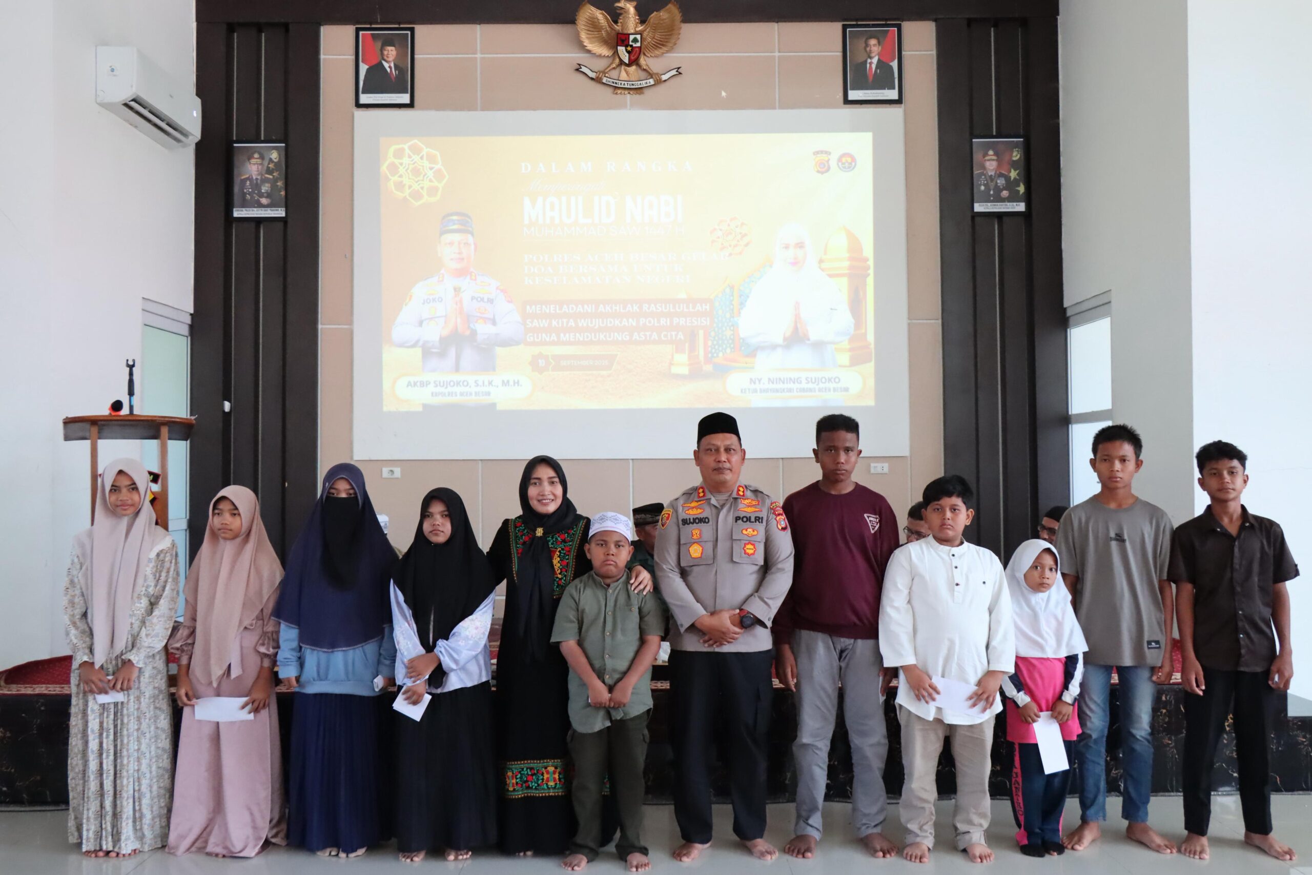 Aceh Besar,|Bijeh.com – Dalam semangat meneladani kehidupan Nabi Muhammad SAW, Polres Aceh Besar menggelar Doa bersama dan peringatan Maulid Nabi Besar Muhammad SAW 1447 H dengan tema ” Dengan Meneladani Akhlak Rasulullah, Kita Wujudkan Polri Presisi Guna Mendukung Asta Cita ” bertempat di Aula Satya Haprabu Polres Aceh Besar, Rabu (10/09/2025)