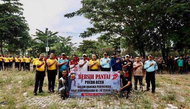 Banda Aceh ||Bijeh.com — Dalam rangka menyambut Hari Bhayangkara ke-79, Polda Aceh menggelar aksi bersih-bersih pantai di kawasan Ulee Lheue, Kota Banda Aceh, Jumat, 20 Juni 2025. Kegiatan yang sarat makna ini dipimpin oleh Direktur Samapta Polda Aceh Kombes Pol. Ery Apriyono.