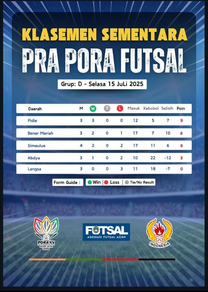 Pertarungan panas di Grup D Pra PORA Cabor Futsal akhirnya mengukuhkan dominasi Pidie. Walau masing-masing tim masih menyisakan satu pertandingan lagi, hasil head to head telah memastikan posisi Pidie di puncak klasemen dan tak tergoyahkan. Sementara Bener Meriah harus puas di posisi runner-up.